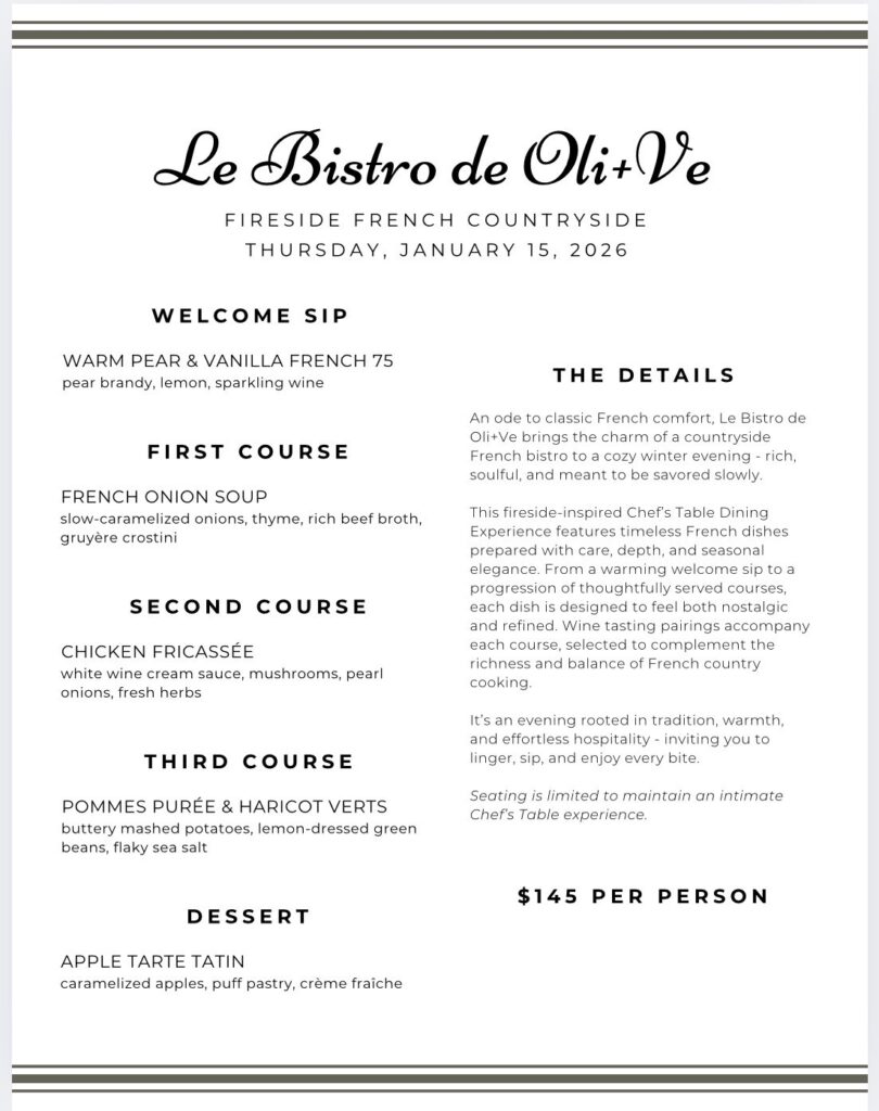 An ode to classic French comfort, Le Bistro de Oli+Ve brings the charm of a countryside French bistro to a cozy winter evening – rich, soulful, and meant to be savored slowly.